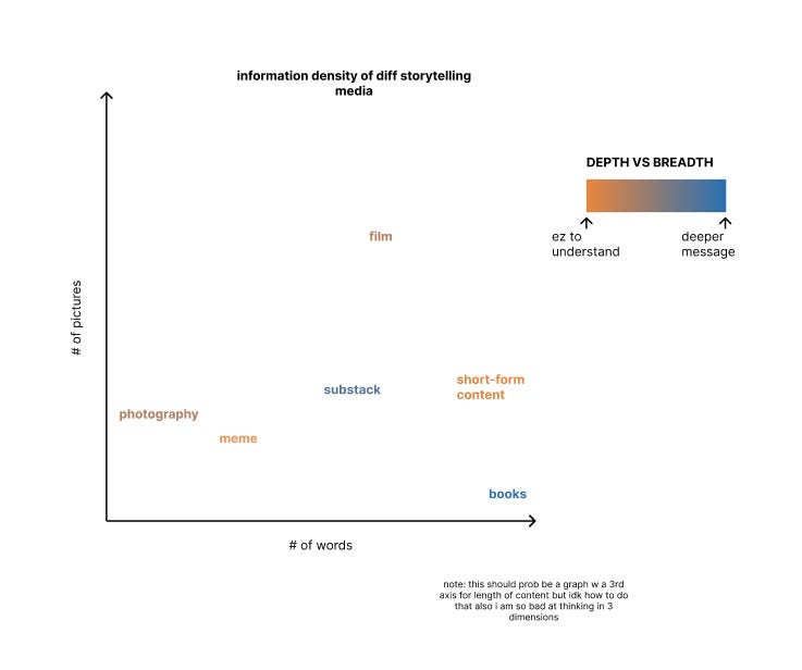 from the audience perspective, we have surrendered control. it’s easy to go on autopilot and let the scenes and sound wash over us, while still come away with some message; for a book, turning off our brain for just one page leaves us confused on what happened. i believe “working” for the content you consume allows for deeper insights — for example, reading a dense article versus watching a tik tok — but it makes the story less likely to be accessible to a general audience. there’s an inverse relationship between breadth & depth, how easy it is to understand a message and how deep it can be.