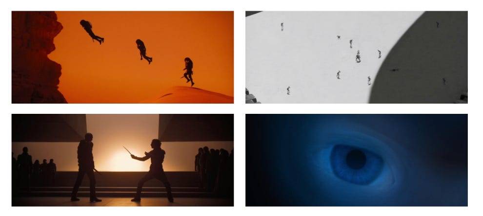 amidst the insane fight scenes & sound design & dialogue, what really popped out was the color palette. my jaw dropped at the tension between the complementary orange setting sun & cool blue eyes. my bones melted at the desert shades of ochre, brown, and gold. my blood ran cold at the absence of color in harkonnen, how alien the bald psychopaths appeared in B&W.